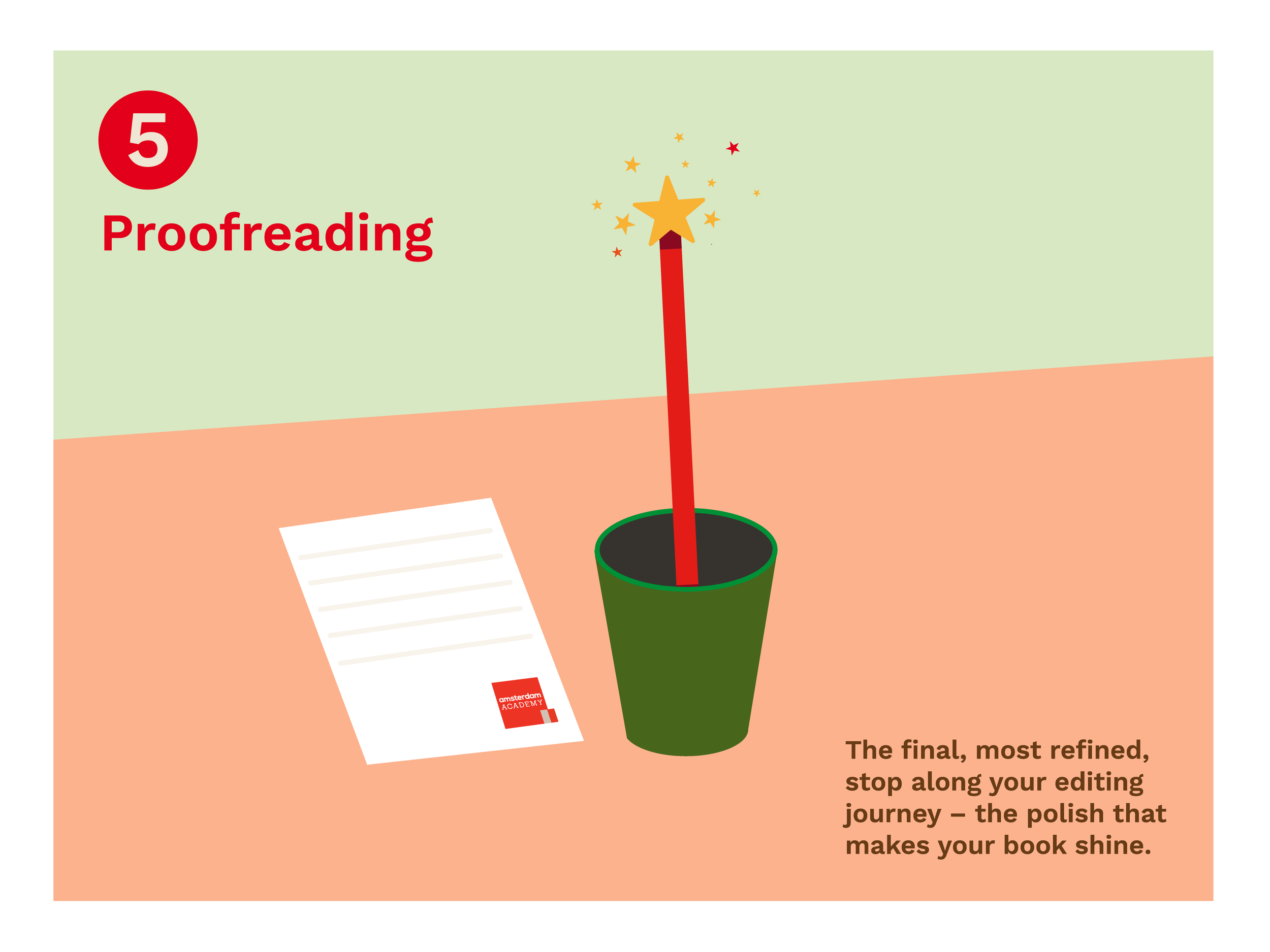 The final check before your book goes to print. Proofreading happens after the book has been laid out, just before it goes to print.